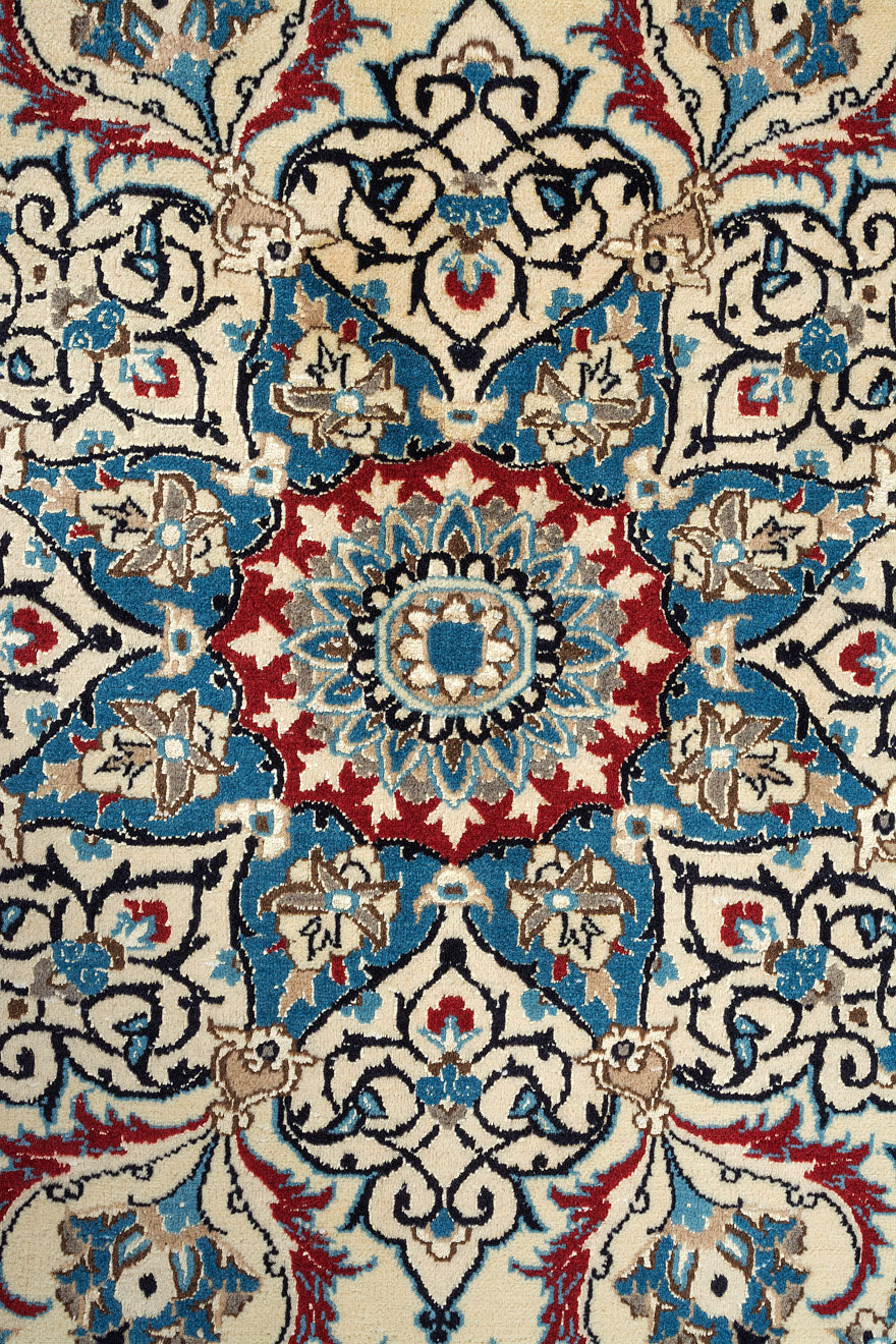 Common patterns include a central medallion surrounded by intricate arabesques and floral motifs. Nain rugs utilize three types of knots: 4La, 6La, and 9La. The term "La" translates to "Layer," indicating the number of thread layers in each warp. This classification helps determine the rug's quality—lower numbers signify finer, denser knots, resulting in a more exquisite carpet.