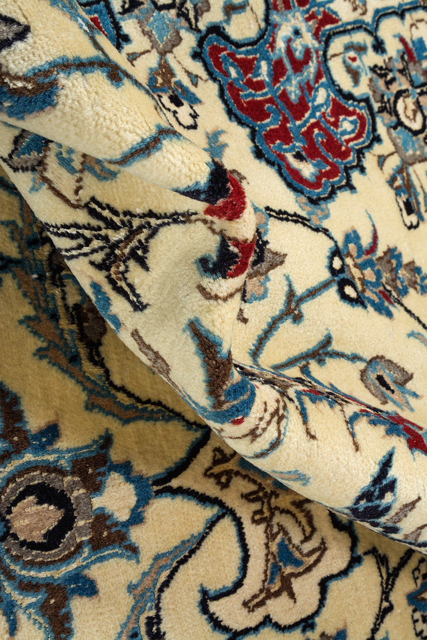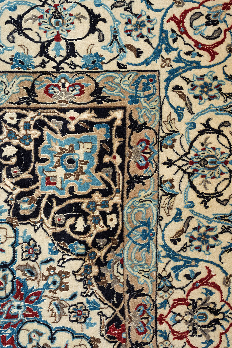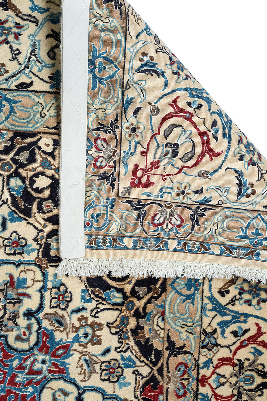 This is a Persian Nain rug, renowned for its fine and precise designs, crafted in a Persian city known for its high-quality workshops. Nain rugs feature a cotton foundation and a soft pile made of either wool or a wool-silk blend. The workmanship is exceptional, with a high knot density often exceeding one million knots per square metre.