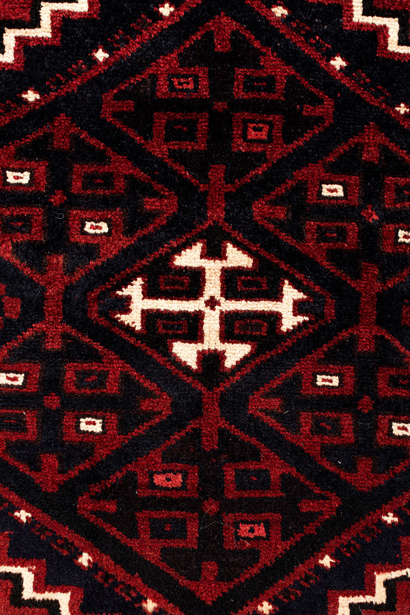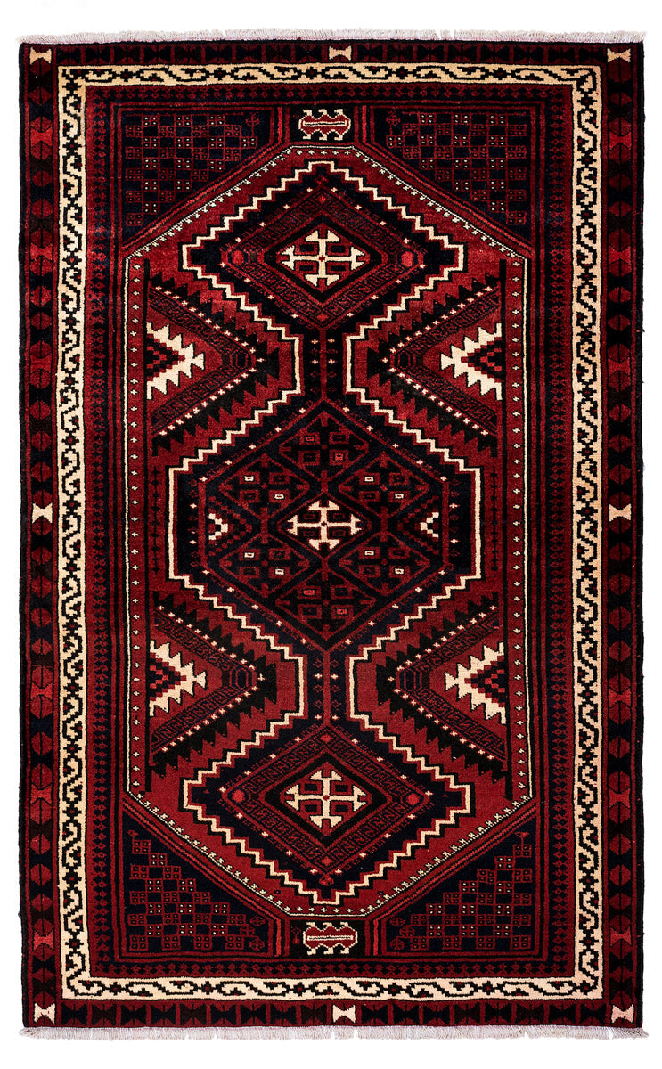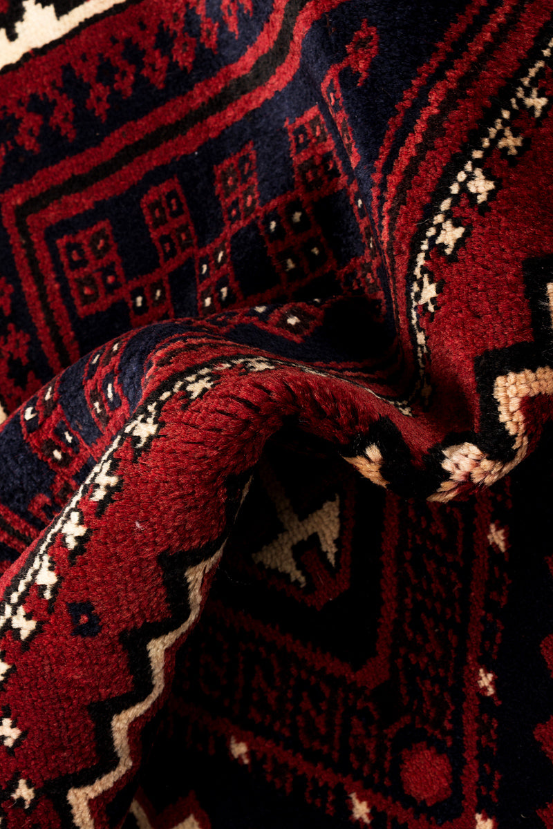 Made by the Lori (also known as Luri) tribes in Iran (Zagros Mountain area). Lori rugs are geometric in design and usually contain animal motifs & figures. They tend to depend on rich combinations of colours – reds, blues, greens, and yellows.
